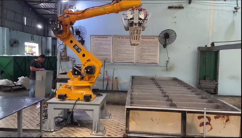 機器人卸膠機:安裝在干燥爐出膠口,干燥車由人工推到指定位置并鎖緊,無需把干燥車與干燥箱分離,啟動機器人按鈕,機器人根據原設定的程序,自動連續工作3分鐘,把干燥車28塊膠卸到輸送帶指定位置,卸完膠后按原工序把空車推到回車軌內,3分鐘完成卸膠工序。干燥車出膠到回車不需改變原設備,產量為8噸/小時,配置操作者1名。